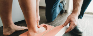 Skip to contentDoctor is taking the footprints of a young woman to built new shoe insoles to help improving her posture